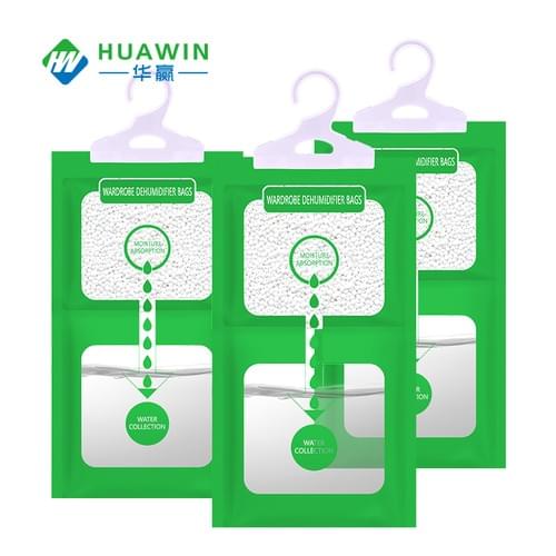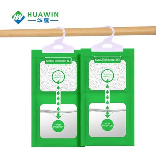 Selected high-quality calcium chloride desiccant particles are used as hygroscopic carriers, which can quickly absorb moisture in the air, and the moisture absorption capacity is as high as 200%. The packaging material uses OPP film and breathable packaging material, which is divided into upper and lower layers, effectively Moisture absorption, scientific water collection, equipped with PP plastic hooks, easy to use.